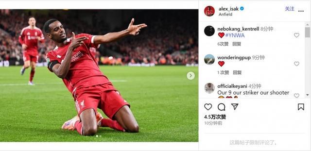 此役伊萨克斩获红军生涯首球,他在社媒晒出比赛照片,庆祝球队取胜+攻入处子球。