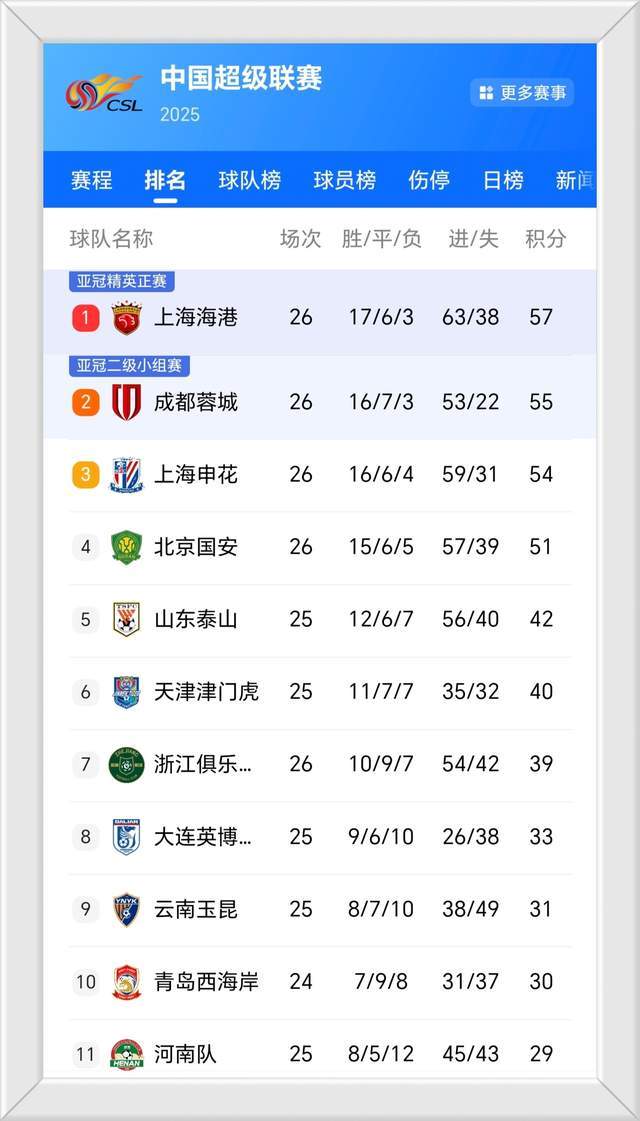 北京国安剩余的赛程有利,又缩小了2分,积51分继续排名的4位。