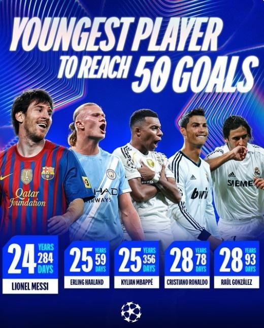 直播吧9月26日宣 对阵那不勒斯的欧冠联赛阶段比赛,哈兰德打进1球成功解锁欧冠50球里程碑。但是,哈兰德并不是欧冠历史打进50球最年轻球员,阿根廷传奇梅西保持着这一纪录。