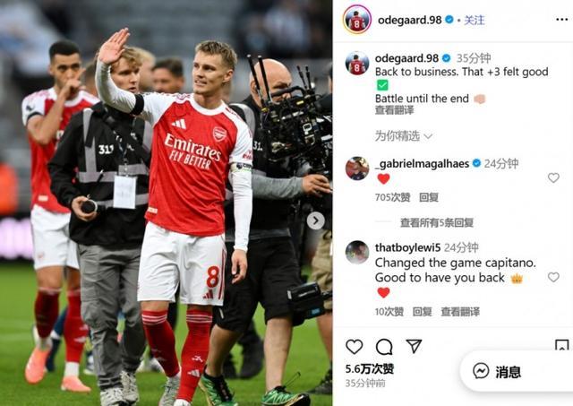 直播吧9月29日宣 阿森纳在本轮英超2-1绝杀逆转纽卡,赛后,厄德高更新了社交媒体。
