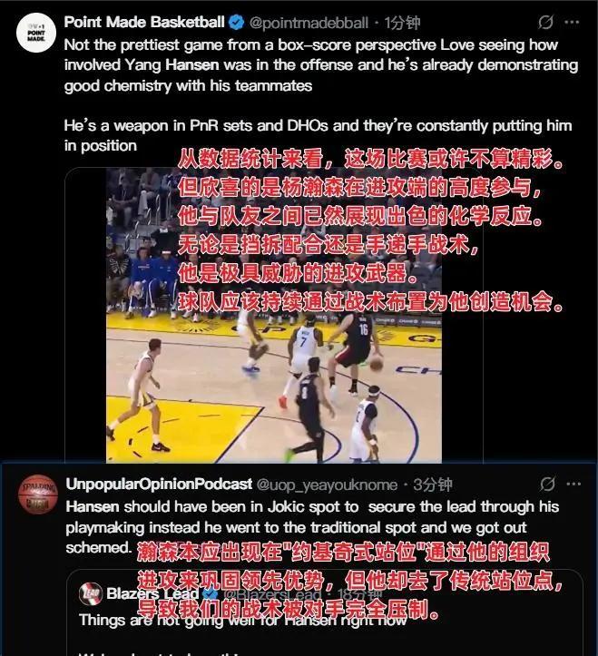 美国网友还在为杨瀚森抱不平:杨瀚森极具威胁开拓者应该多为他布置战术。因为杨瀚森必须要搭配上线的持球,这才能挖掘他在进攻端的威慑力。无奈现在差不多就是顺下,要不就是篮下要球,完全就是一个蓝领的角色了。可惜杨瀚森是新人,估计也不是立马获得这样的战术偏向。