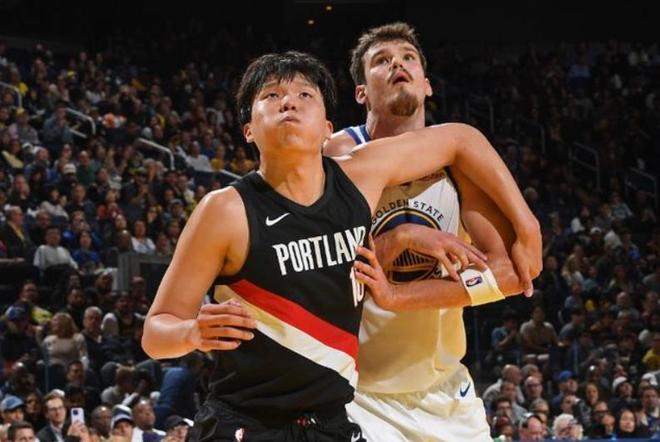 杨瀚森在这场比赛第一次得分是挡拆后顺下接队友助攻,这时候勇士队的库明加和波斯特换防失误,补防也来不及,所以杨瀚森轻松接球上篮打进。杨瀚森的第二次得分是队友阿夫迪亚上篮不中,杨瀚森补篮得手的,面对库明加和波斯特的防守,杨瀚森的身形有些踉踉跄跄,不过还是顺利将球打进。这么来看杨瀚森是有一定的身高优势的,但是核心力量不足,对抗能力差的问题在比赛中显露无遗。