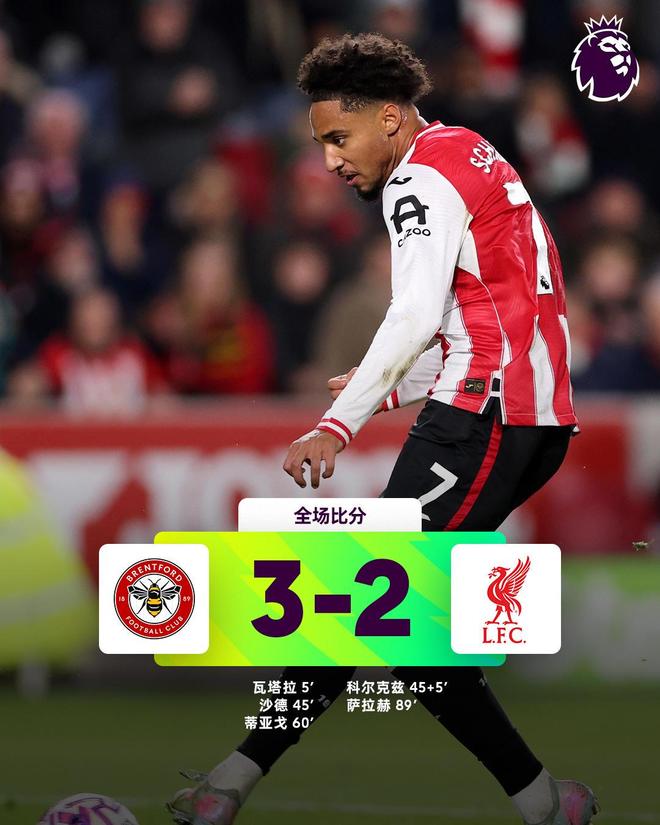 下半场第59分钟,布伦特福德获得点球,蒂亚戈点球罚进,布伦特福德3-1利物浦,第89分钟,萨拉赫破门为利物浦再扳一球,最终,利物浦客场2-3不敌布伦特福德,遭遇联赛四连败。