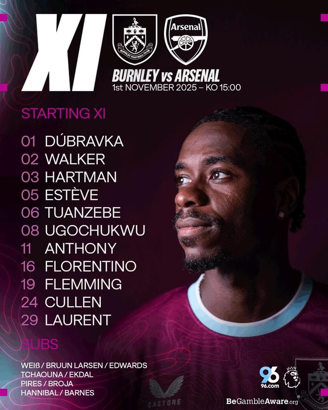 北京时间11月1日23:00,英超联赛第10轮继续进行,阿森纳客场挑战伯恩利,赛前双方首发阵容陆续公布: