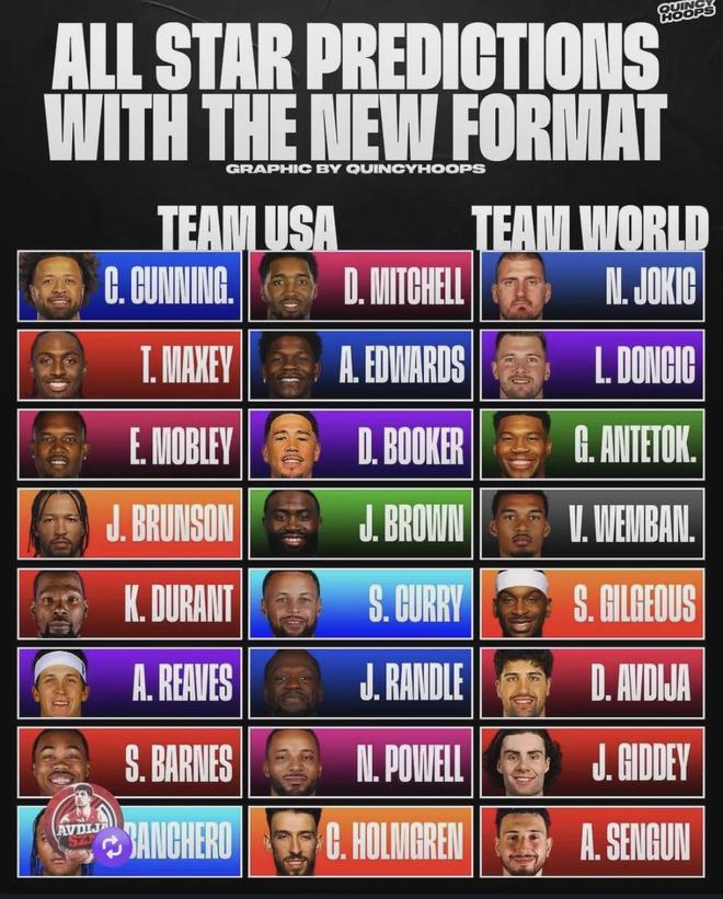 如果不受伤的话,国际队首发五人基本确定:约基奇、文班亚马、字母哥、亚历山大、东契奇。国际队剩余三个替补名额,目前是这几个球员在争夺:小瓦格纳、申京、阿夫迪亚、马尔卡宁、贾马尔-穆雷、约什-吉迪、西亚卡姆……