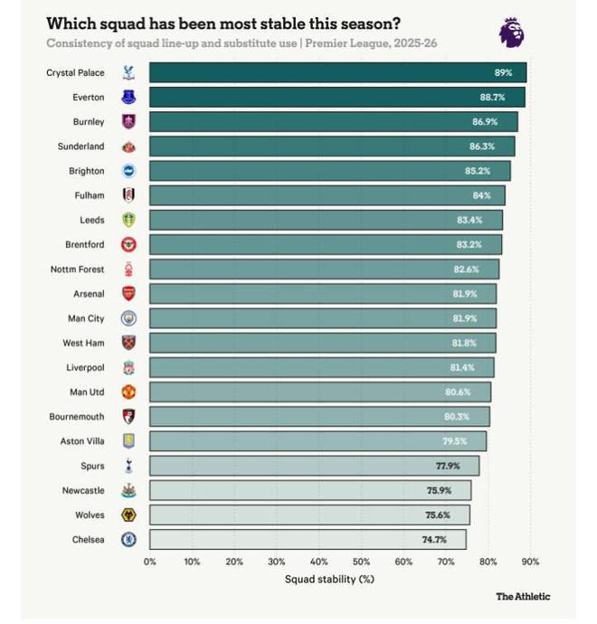 12月18日,The Athletic发布文章,对本赛季英超各队的出场阵容稳定度进行了分析,其中,水晶宫是稳定度最高的球队,切尔西最低。