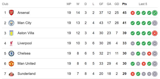 紧随其后的是积41分的曼城,他们仍是阿森纳最强劲的追逐者,但近期状态有所波动。异军突起的阿斯顿维拉以39分稳居第三,成为了本赛季最大的黑马,加入了争冠集团的行列。卫冕冠军利物浦目前积33分排名第四,在经历了一波丢分后,争夺冠军的希望已相当渺茫,正为巩固欧冠席位而战。